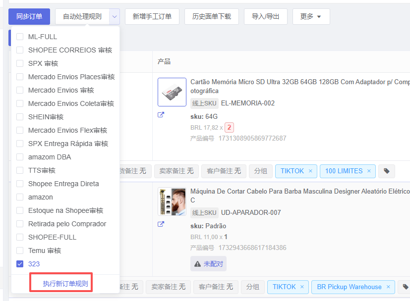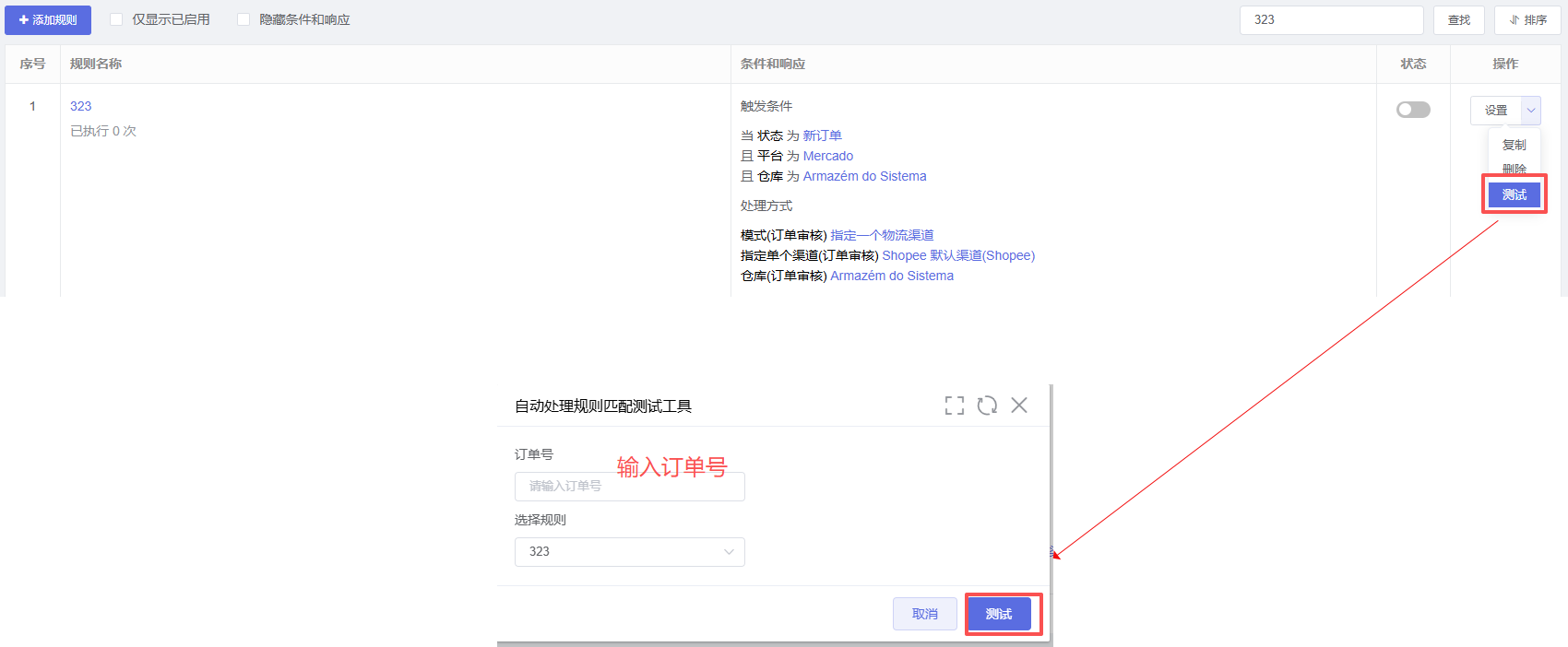 3、已有订单如果执行新设定的规则,在订单列表自动处理规则下拉选择规则,点击新订单规则。列表上的订单均按新规则逻辑执行一次。