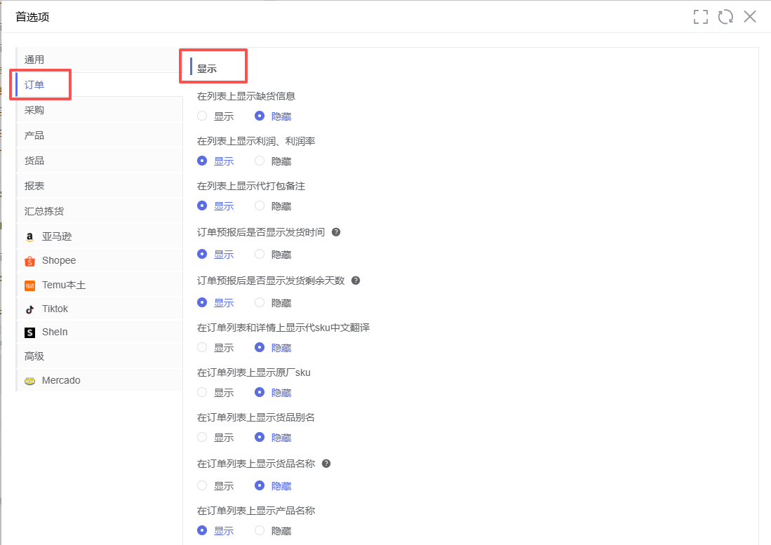 订单列表的信息是不是显示的有点少了,好不方便? by 2025-10-23 订单列表的某些我想要看的字段没显示,以下一招帮你轻松解决。 1、在订单列表中点击设置 2、点击设置后打开首选项配置,在订单--显示,可根据需要进行配置字段是否显示。 请输入关键词搜索帮助 目录 最新帮助46 新手教程3 首页/初始化向导/公告1 产品/采集/认领/刊登6 营销/活动/折扣/秒杀0 订单/拣货/面单10 物流/渠道/运费1 货品仓库/出入库/产品配对5 采购/建议/计划1 客户/客户管理/黑名单0 发票/账号/税种/发票下载9 报表/总预/分析/汇总/明细0 系统/账户管理/店铺授权/实用工具10 平台0